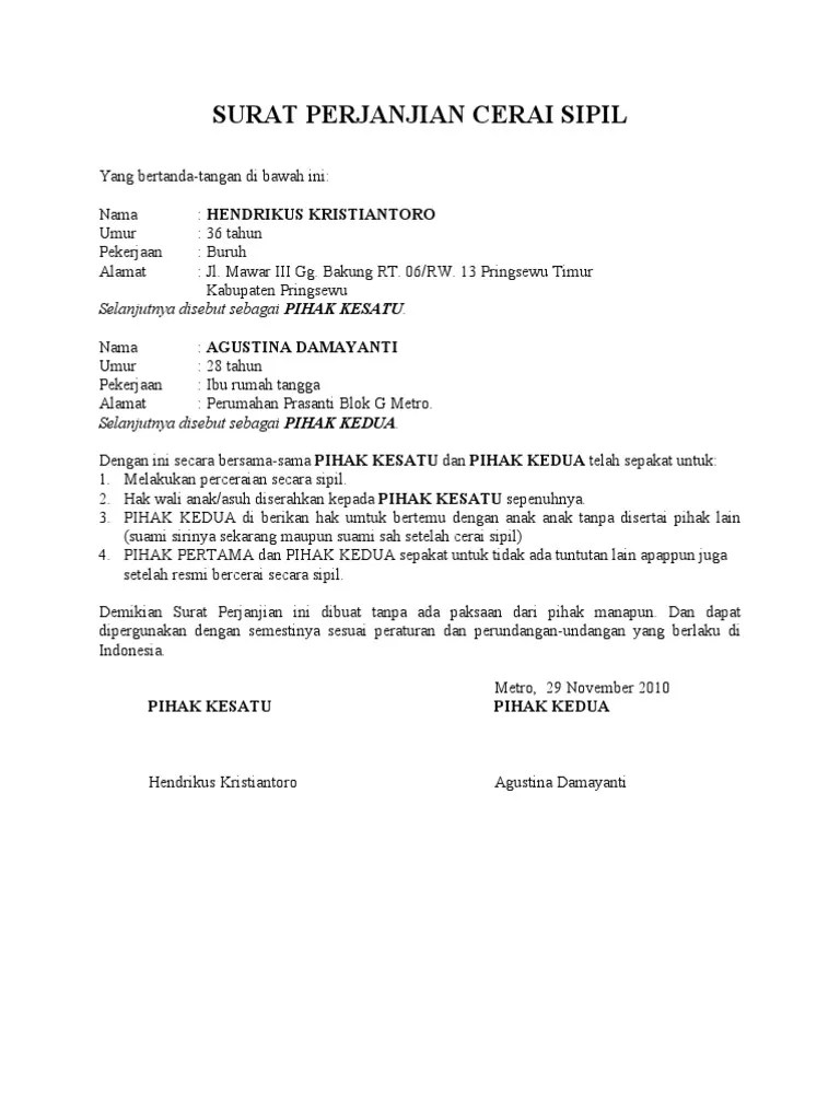 Ulama mazhab maliki mendefinisikan khuluk . Menimbang, bahwa untuk membuktikan dalil gugatannya tentang perceraian,penggugat . Surat menteri dalam negeri ri tanggal 9. Akta kesepakatan surat kesepakatan kerja bersama. Berikut adalah beberapa contoh surat pernyataan cerai yang bisa.